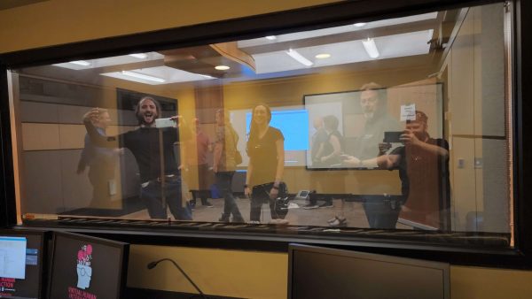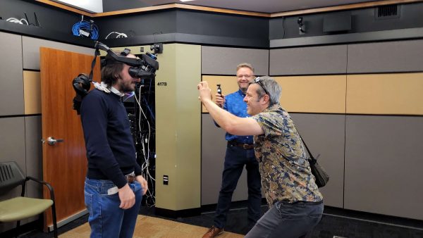 At Stanford, we entered the VR research room, where study participants experience simulations and can be observed by study facilitators on the other side of the glass wall! This room is even equipped with a haptic floor! To demo it, Cause participated in their Earthquake Safety Training simulation. With his headset casting to the big screen, we all watched and encouraged him to find shelter, as the floor rumbled beneath our feet! Thanks to Brian Beams from Stanford’s VHIL for being a great host!