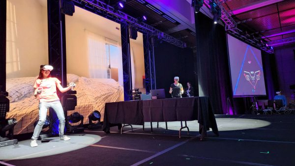 Starting with her morning workout, Sophia was joined by Christi in on stage for a VR game of SynthRiders! Later that day, Sophia’s client was in panic: her project needed to be saved, and they were joined on stage by their VR wiz, Cause. After an eventful day in the metaverse, Sophia enjoyed dinner out at an AR-enabled cafe with Christi and friends joining her on stage for the final scene.