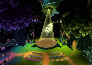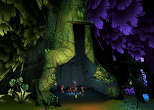 You start in a classic Hollywood theater lobby entrance. Walk up the stairs and down the hall into a small hut which then opens up into a deep and wild forest setting complete with characters, interactive props, and glowing eyes that watch you from the thickets! There are grabbable set pieces, selfie moments with the main characters, and artwork from the film to be examined up close and admired. We’re incredibly proud of the four months of hard work that went into crafting this beautiful experience and we hope you get to see it yourself! It’s free and open to the public in AltspaceVR.