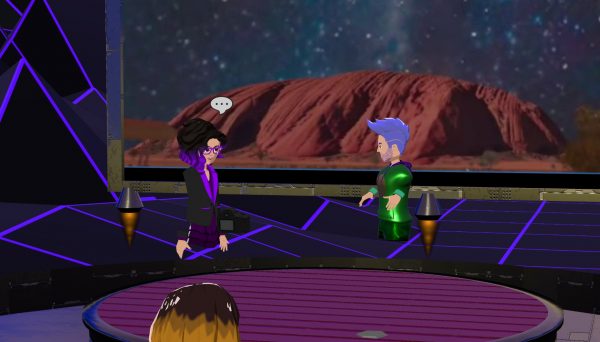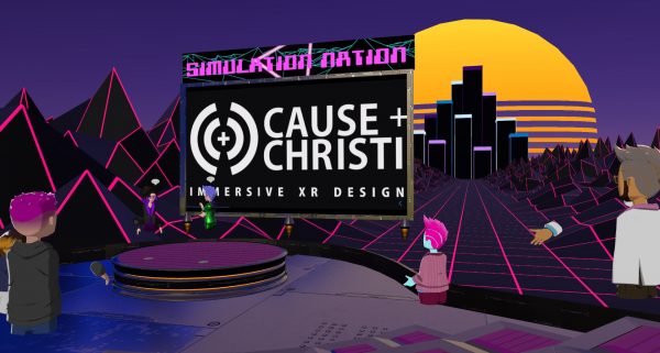 Have you heard about Johnny Android and his Simulation Nation podcast? With nearly 150 episodes in the bank at the time of writing this, he hosts a new live interview show every single week. His guest range from musicians, to writers, virtual creators, and more. They are all quite interesting and up until recently all of his episodes were broadcast live from AltspaceVR. Originally he hosted the show in a kit-bashed world he built himself from Altspace community-shared items, but we eventually stepped in with a very cool flying retro futuristic cyber punk stage design that fit perfectly with his show’s vibe. In fact the entire world is basically his show’s intro logo come to life around the audience! We’ve both been interviewed by Johnny for his podcast in the past and even both attended the final panel of experts the day before Altspace was set to sunset. We have since moved his show over to Spatial for now.