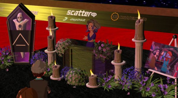 Along with providing the volumetric stage we also designed the AltspaceVR Funeral, which the broadcast cuts to midway. Athena Demos, cofounder of BRCvr and trusted community liaison, gave a heartfelt eulogy as a glass casket containing the original robot avatar and draped with a black flag adorning the AltspaceVR logo floated gently down the black carpet aisle to come to a standing rest next to a podium covered in candles and flowers. It was a touching scene and we are honored to have been able to provide the necessary settings and pieces.